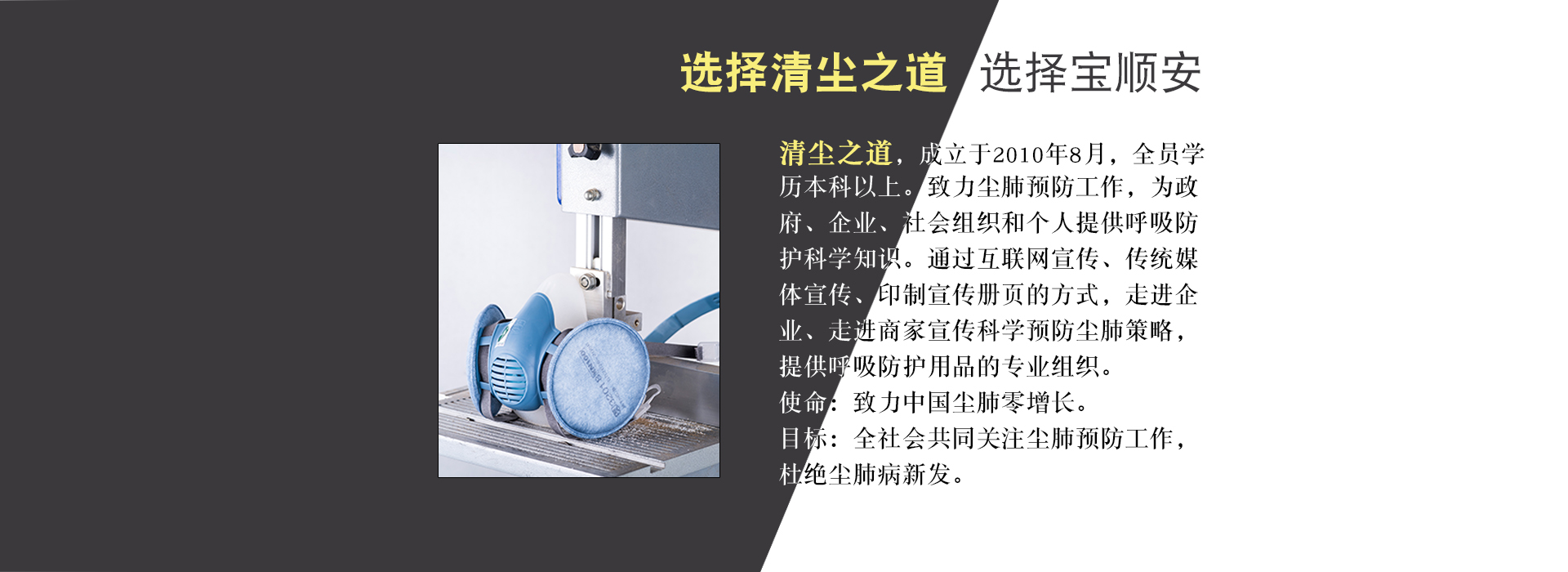 ——清塵之道特種勞動防護用品有限公司成立于2010年,是一家集呼吸防護公益宣傳、提供呼吸防護解決方案、協助合作伙伴培訓、拓展市場、提升管理水平,為有需要的企業和從業人員提供寶順安品牌防塵、防油煙口罩,防毒面具為一體的公司。